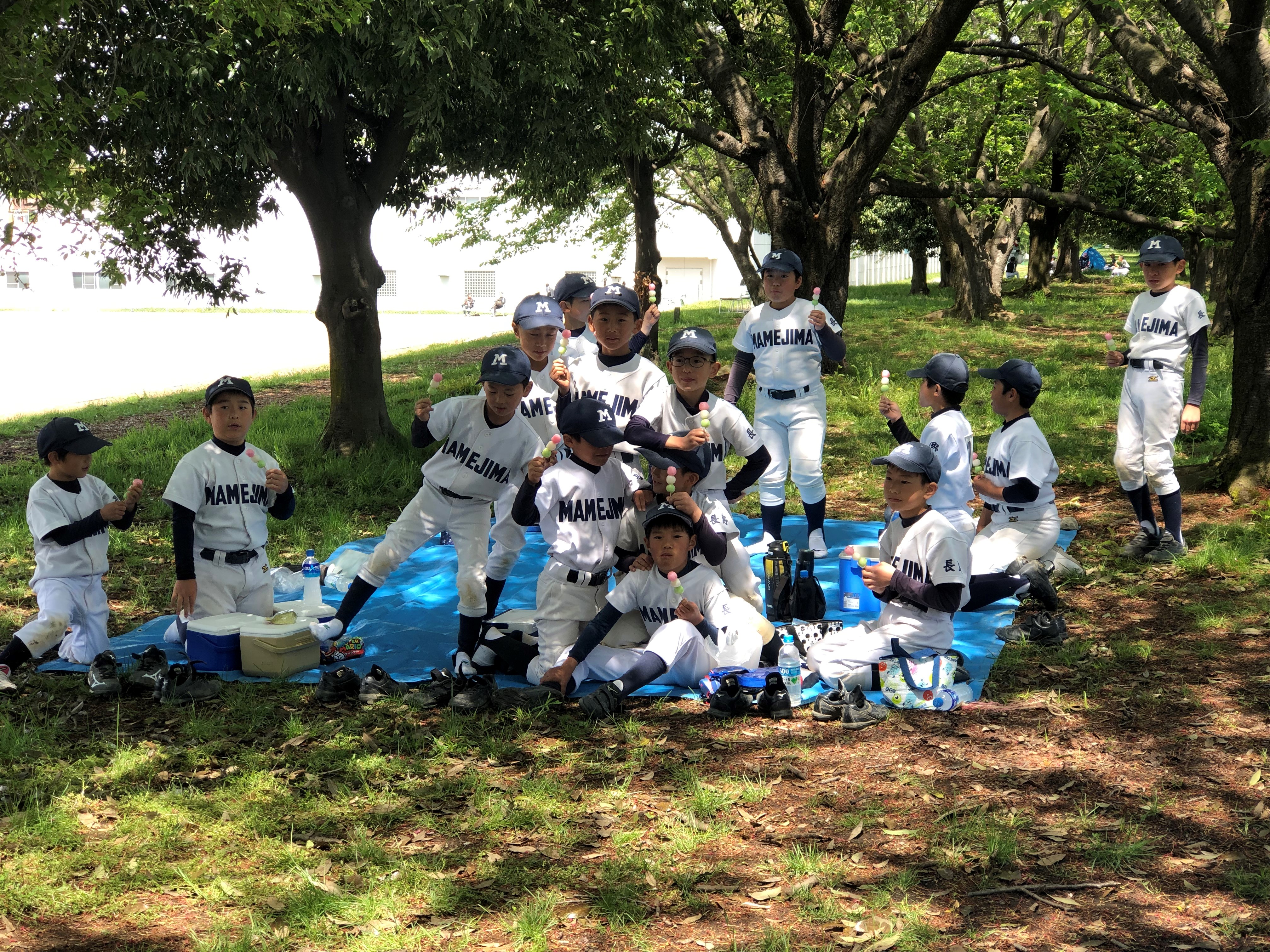 お花見には少し遅くなってしまいましたが、大豆島運動場土手でおにぎりを食べてデザートにお団子を食べました。